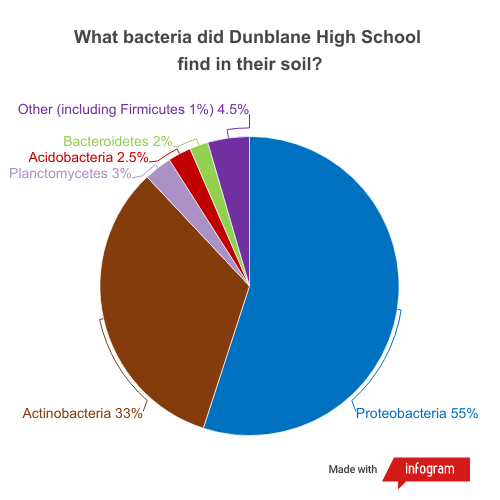 DNA sequencing results for soil sample map pin 43125 have arrived and we are analysing them. The soil sample from this site contained 4,279,087 reads (fragments or short pieces of DNA). Find out how to interpret the pie-chart here: bacteria pie charts learning activity. Find out more about the different phyla of bacteria found using the links below and explore the top 15 genera found!
