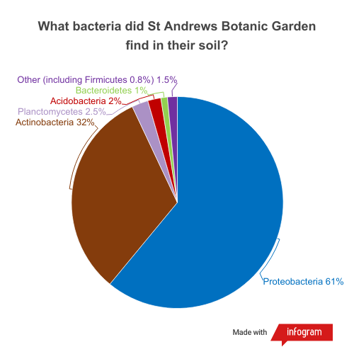DNA sequencing results for soil sample map pin 41735 have arrived and we are analysing them. The soil sample from this site contained 5,272051 reads (fragments or short pieces of DNA). Find out how to interpret the pie-chart here: bacteria pie charts learning activity. Find out more about the different phyla of bacteria found using the links below and explore the top 15 genera found!